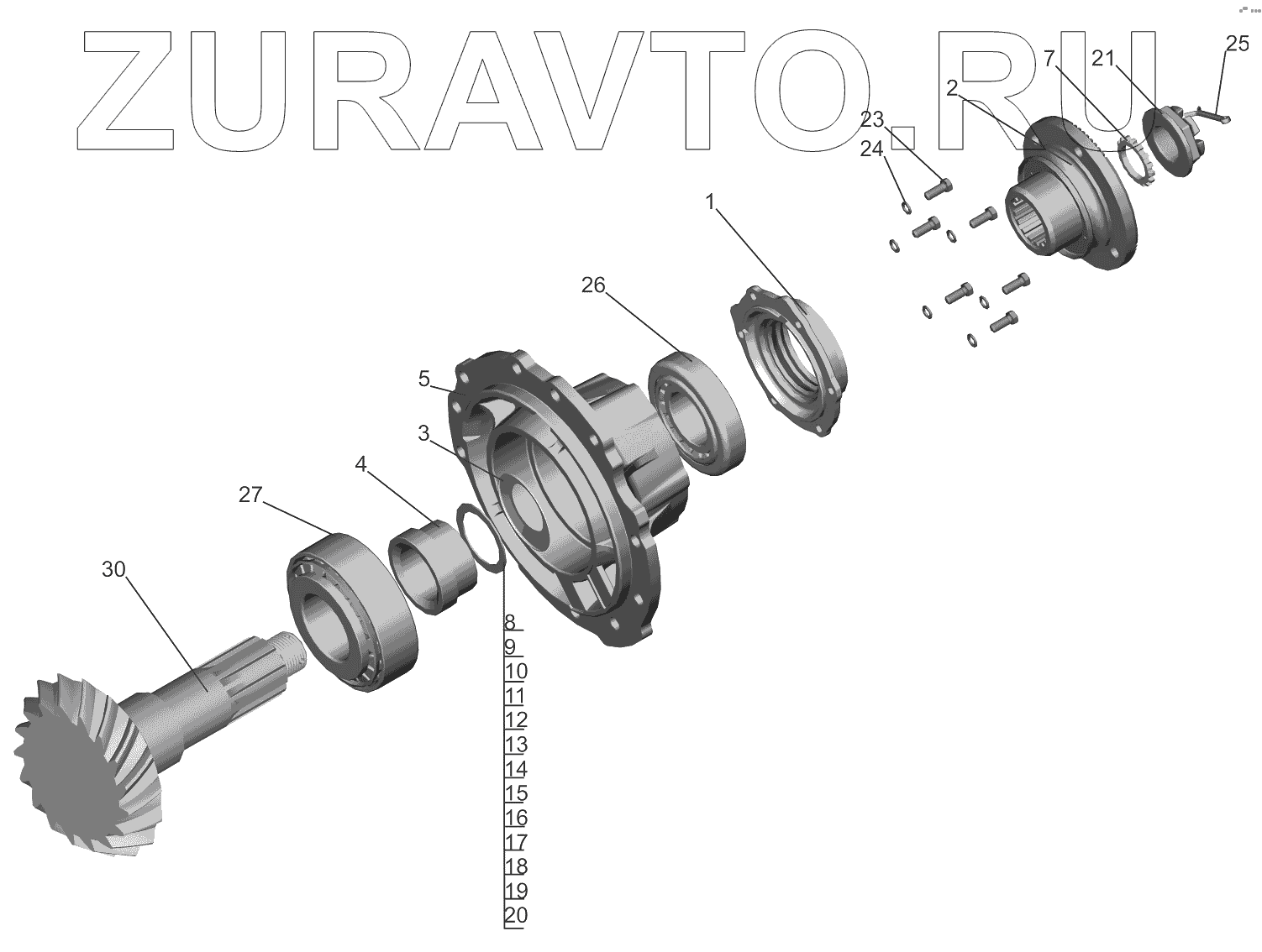 | 25 | 6-27613А1 | Подшипник роликовый конический редуктора среднего моста | Нет в продаже |