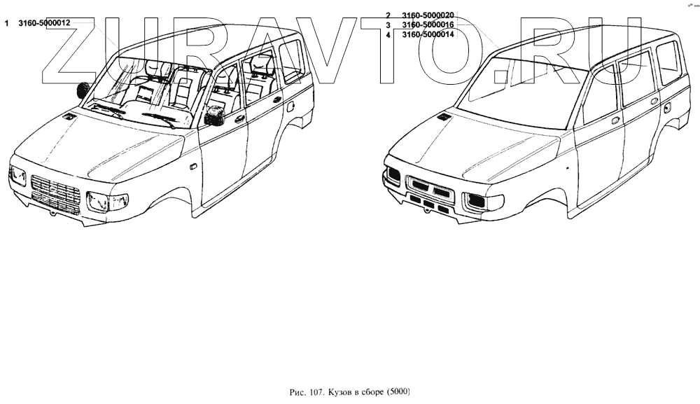| 2 | 3160-5000020 | Кузов в сборе с дверями и крышкой капота, без окраски, обивки, электрооборудования, остекления, сидений, арматуры | Нет в продаже |