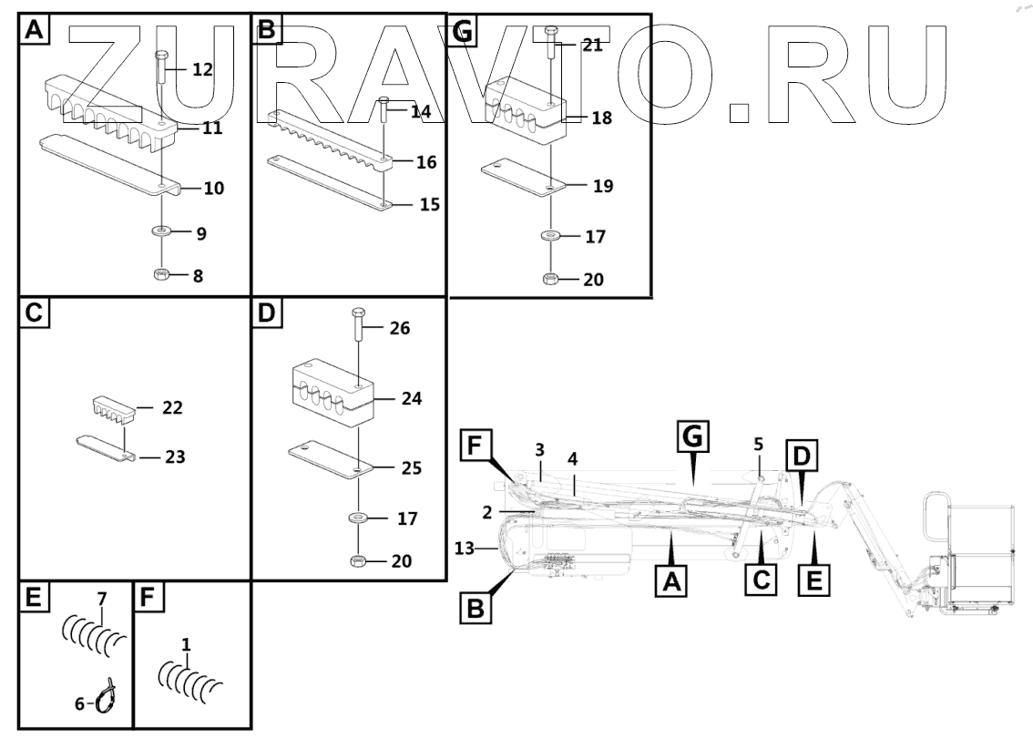 | 22 | 25080006601 | Pipe clamp, for fixing boom telescopic cylinder hydraulic pipe | Нет в продаже |